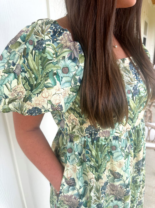 Green Floral Bubble Sleeve Dress