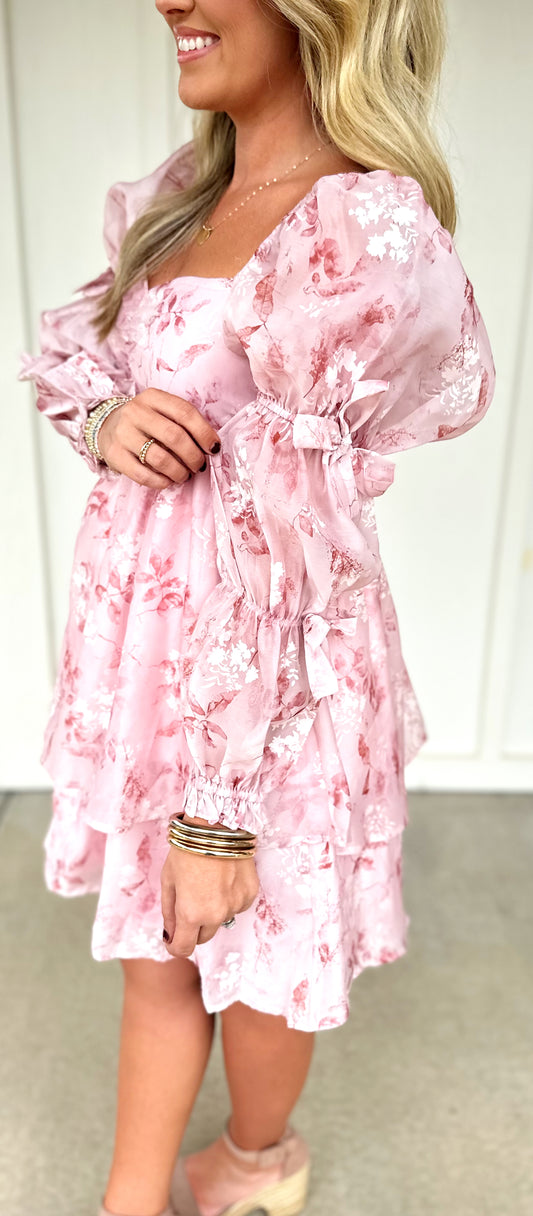 Pink Floral Bow Sleeve Dress