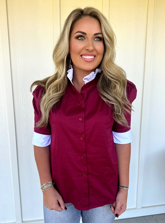 Burgundy/White Ruffle Collar Top
