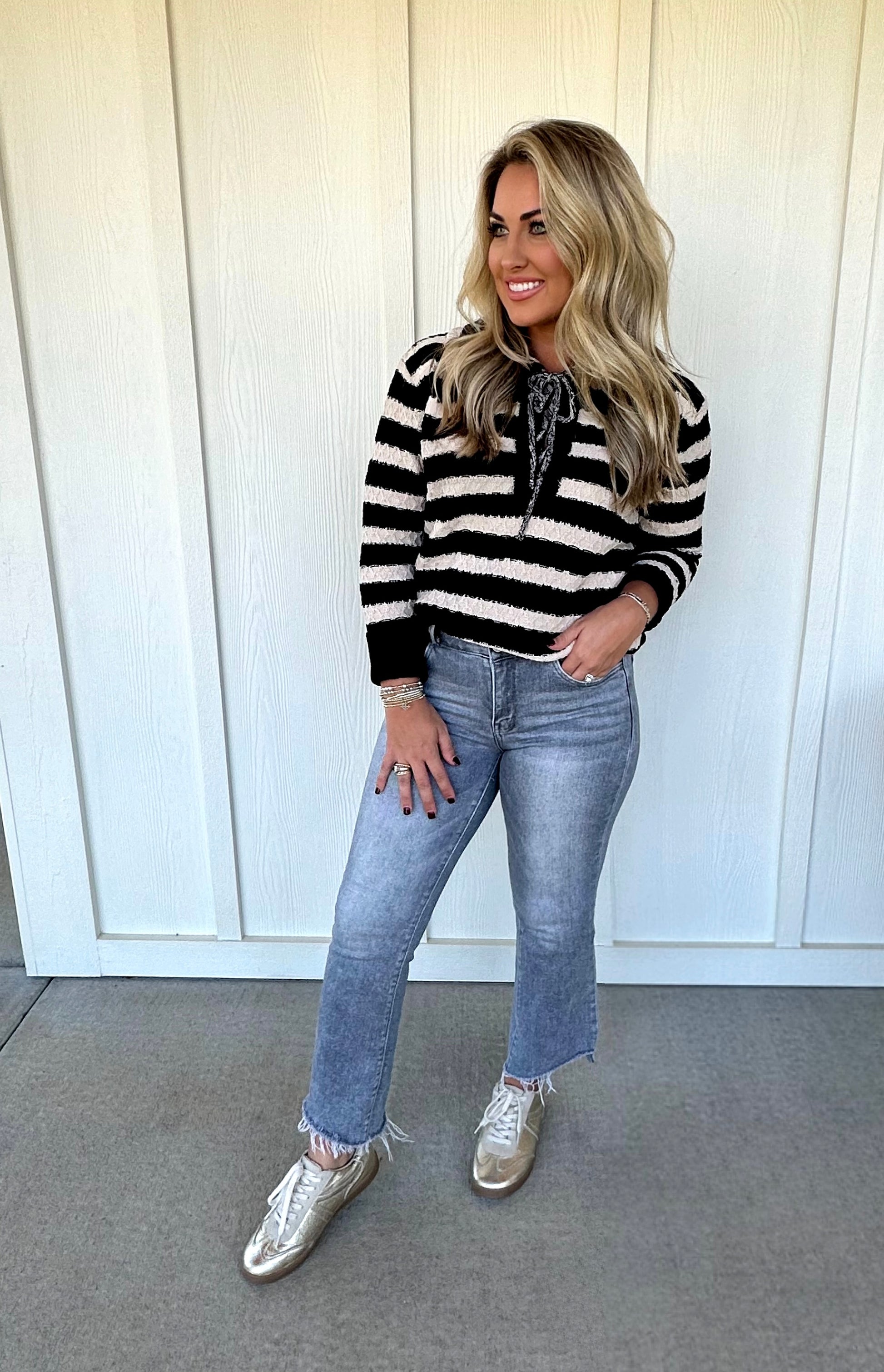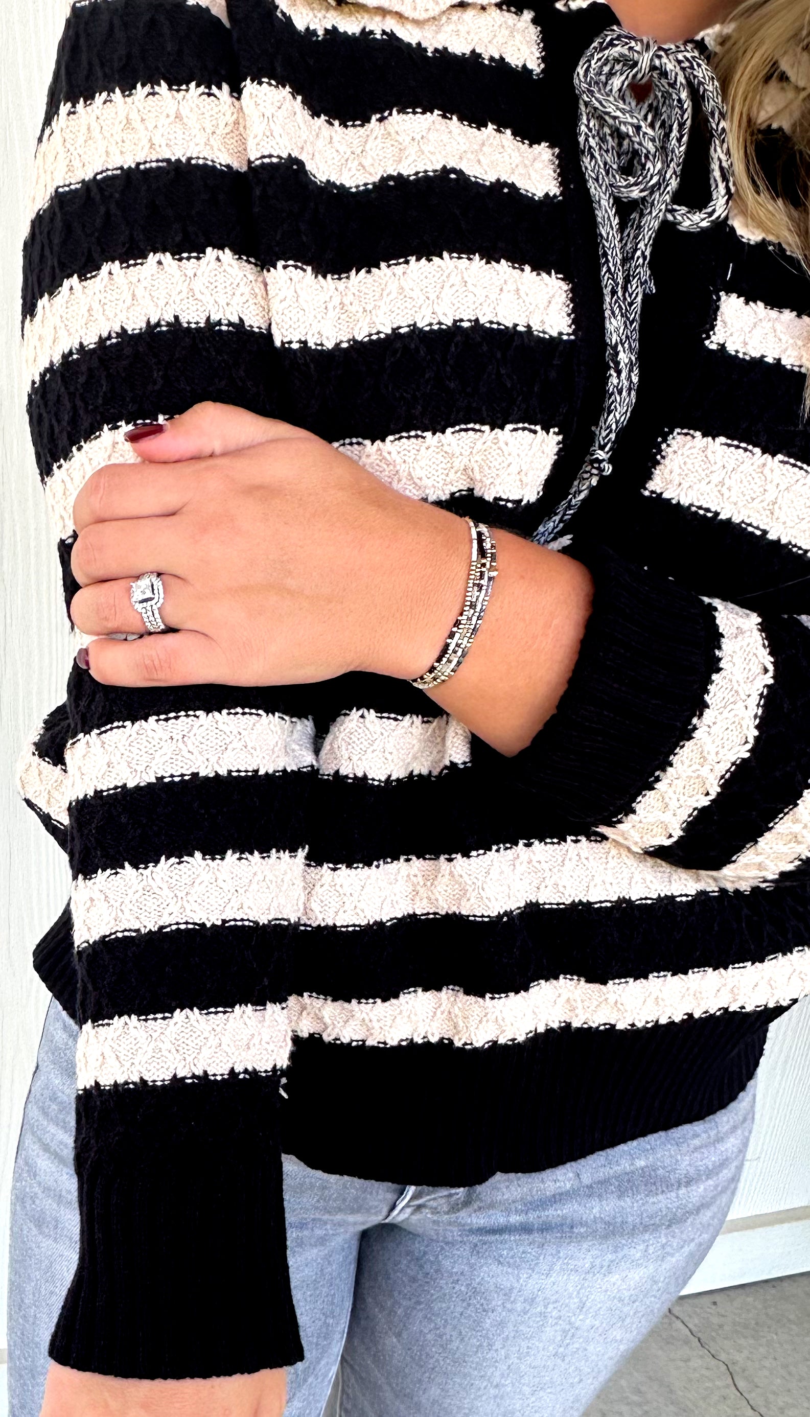 Striped long sleeve lace-up knit top featuring cable texture and thick ribbed lace-up placket. Ribbed cuffs and hem. Unlined. Knit. Non-sheer. Medium weight.